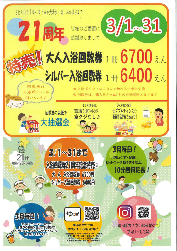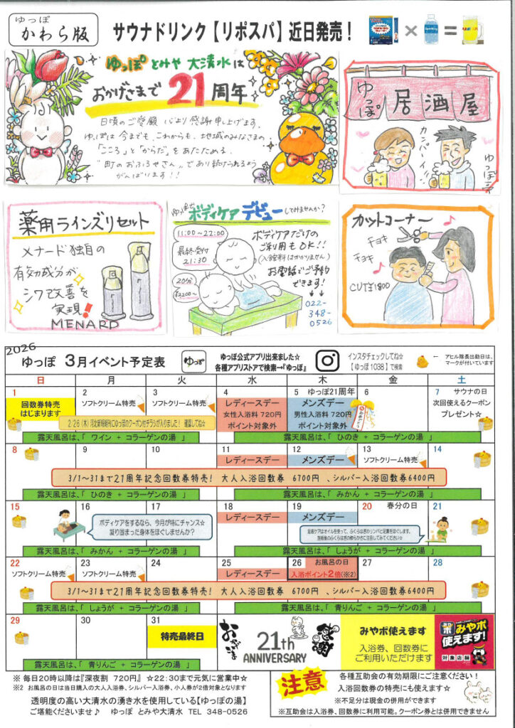 3月のイチオシ!…21周年月間☆【入浴回数券の周年記念特売。】【ボディケアやカットコーナーのイベント】 2026 2/27 イベント情報 2026年2月27日 「イベントカレンダーはこちら」ボタンから詳細をご確認ください! 皆様のご来館を心よりお待ちしております! イベントカレンダーはこちら イベント情報